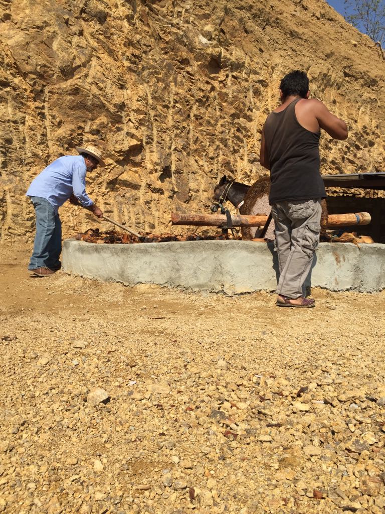 Una vez que las piñas se cocieron y están a temperatura ambiente, se procede a despedazarlas con un machete, para obtener trozos de un tamaño mediano y así poder colocarlas en nuestro molino de cantera, con una rueda de piedra "Tahona" la cual es arrastrada por un caballo, se logra desgarrar cada trozo de la piña y obtener una pasta la cual es llamada "mosto".
