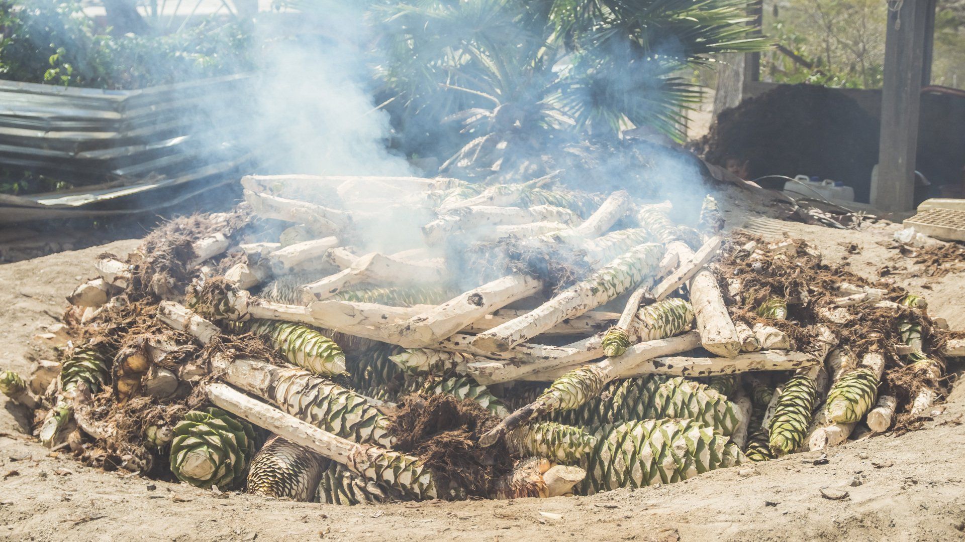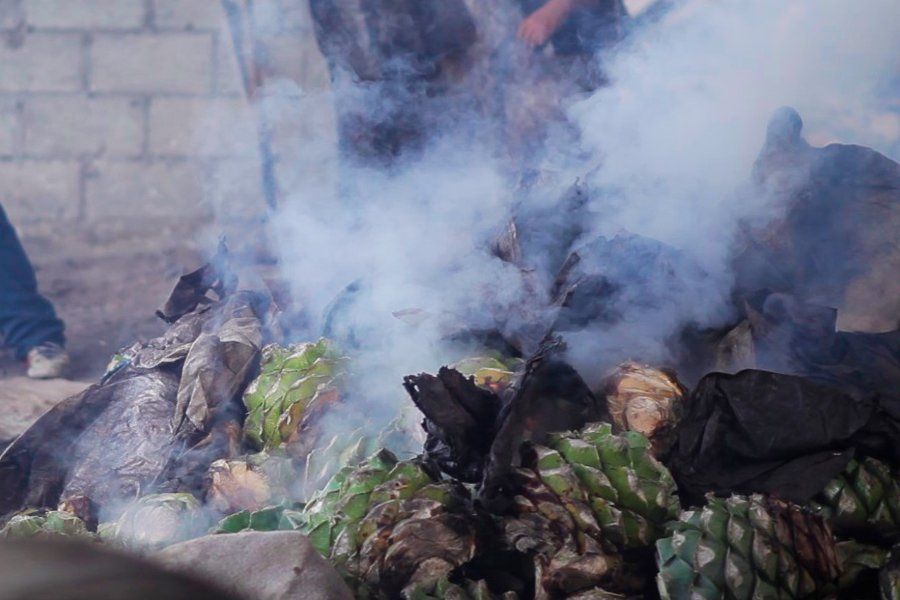 Una vez cortadas las piñas (corazón de agave) son trasladadas a nuestro palenque, para ser depositadas en un horno cónico, sobre una cama de leña caliente y cubiertas en su totalidad por piedras de río al rojo vivo y finalmente una capa de tierra, técnica milenaria que ha pasado de generación en generación a nuestro Maestro Mezcalero Don Robert, en este momento dejamos que la cocción se lleve a cabo.